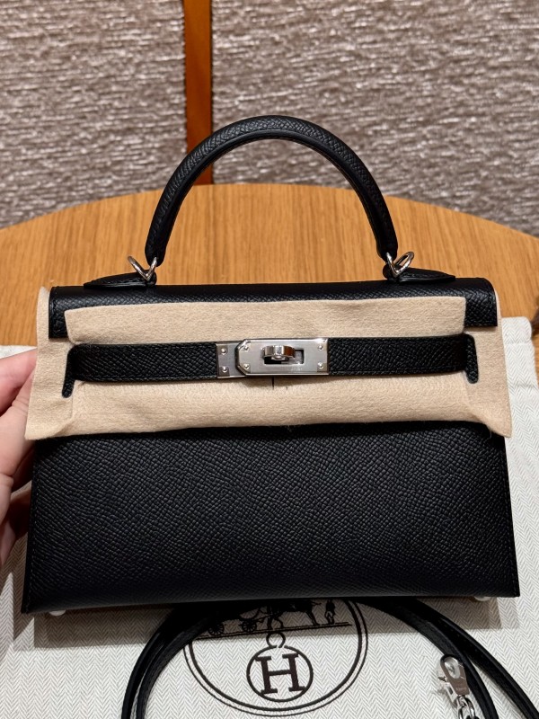 에르메스 Hermes Mini Kelly 19cm Epsom 89 Noir and 3Q Rose Sakura/silver