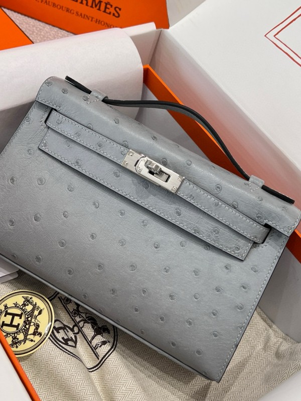 에르메스 Hermes Kelly Pochette KK ostrich 8U Blue glacier/silver