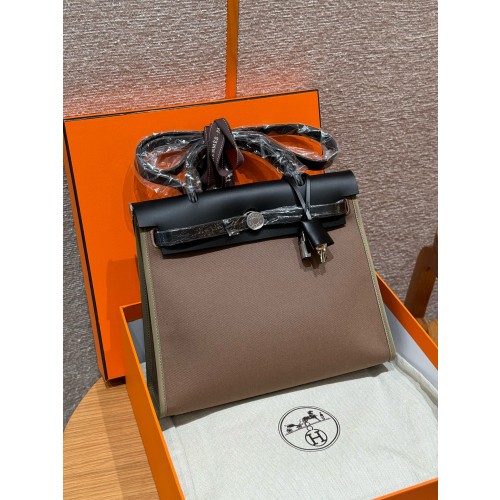 에르메스 Hermes Herbag 31cm canvas and cowhide 18 Etoupe and 89 noir/silver