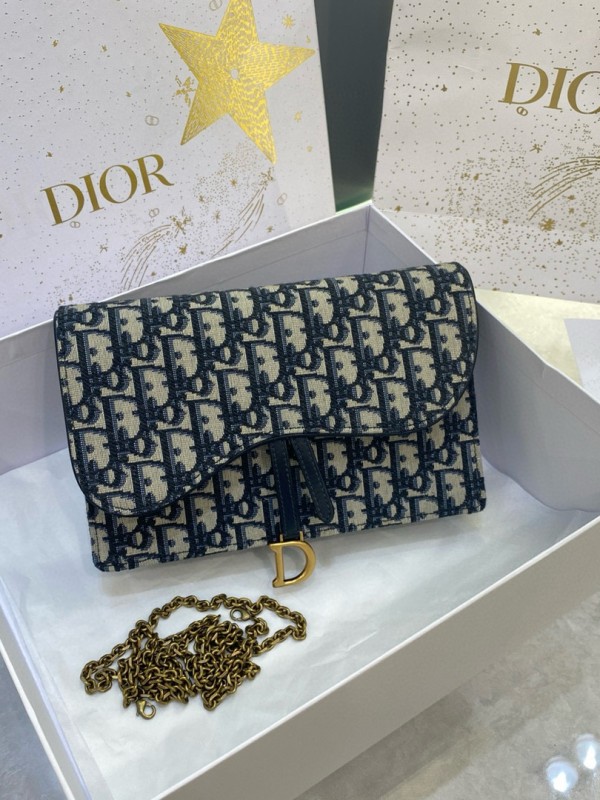 디올 Dior Saddle Pouch with Chain Oblique Jacquard Blue 22cm