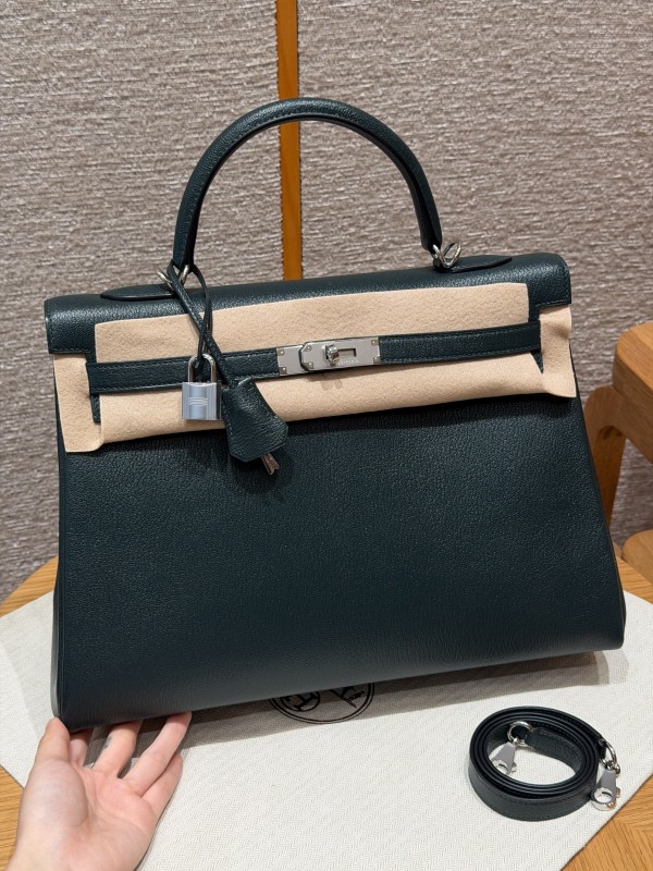 • 에르메스 Hermes Kelly 35cm Chever 67 Vert Fonce/silver