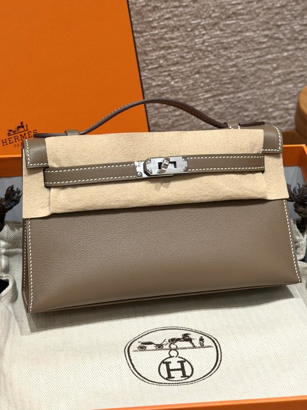 에르메스 Hermes Kelly Pochette 22cm Swift 18 Etoupe and 5P Pink/silver