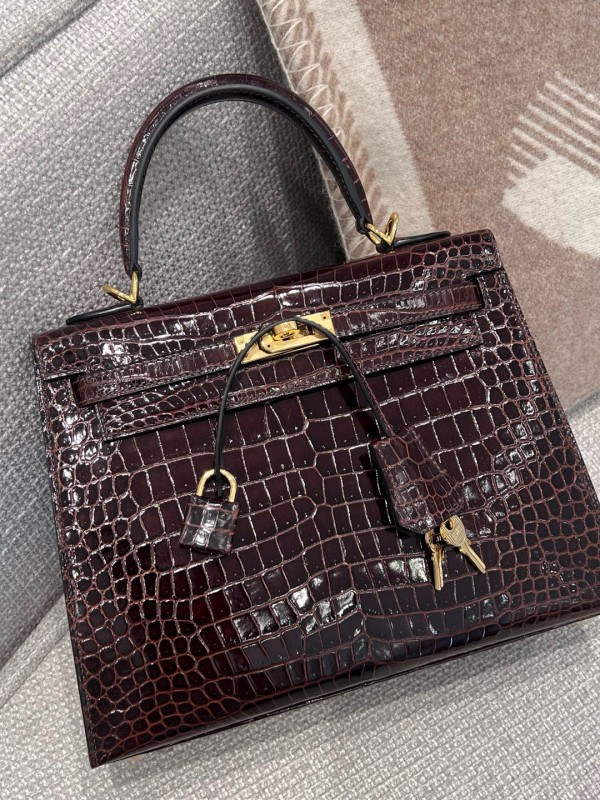에르메스 Hermes Kelly 25cm Hcp Porosus 47 Chocolate/gold