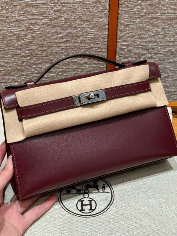 에르메스 Hermes Kelly Pochette 22cm Box 57 Bordeaux/silver